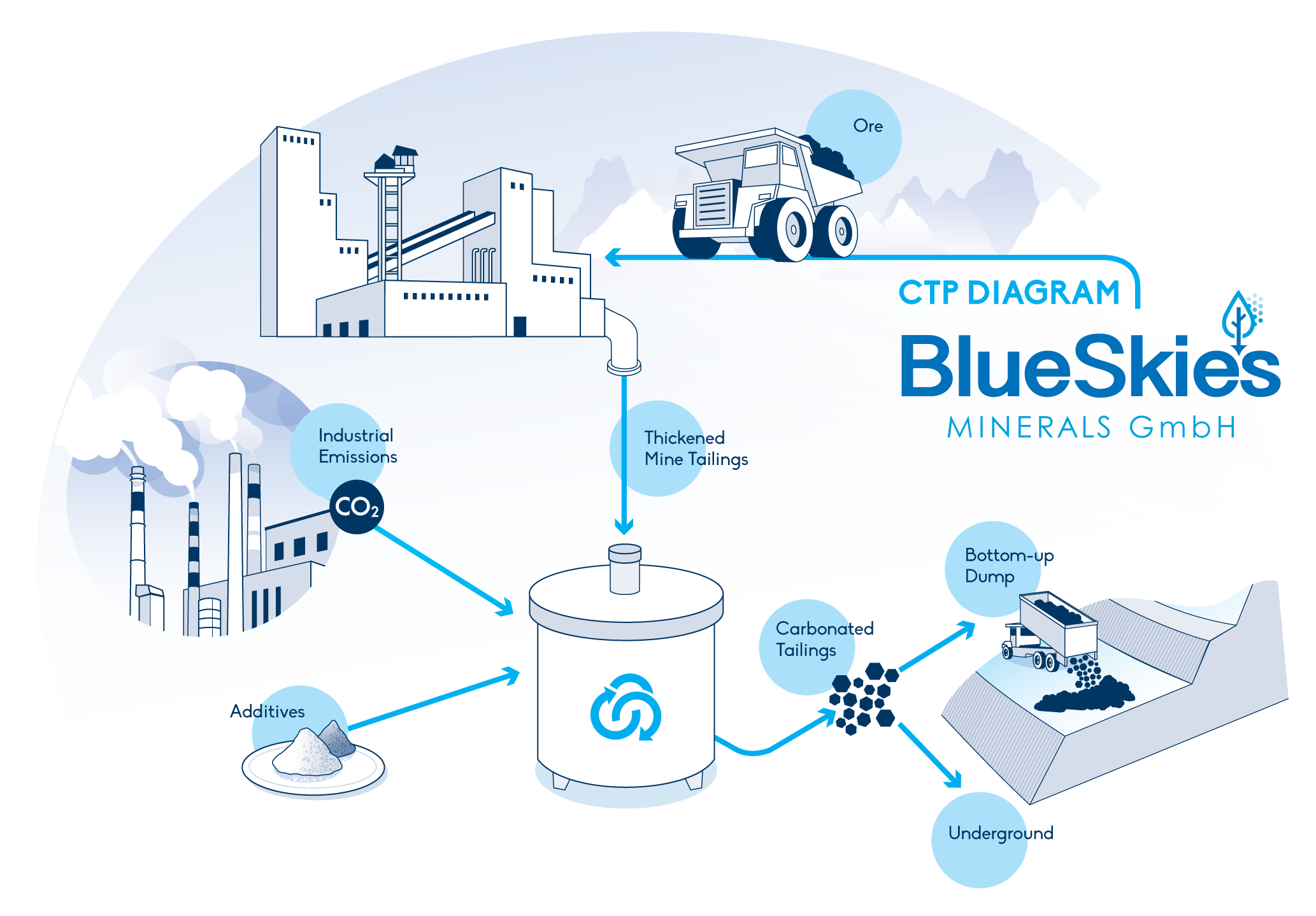 Blue Skies Minerals is developing the Carbonated Tailings Process. In this process, carbon is captured and recovered as a gas or a carbonated solution, then it is blended with ground mining wastes (mine tailings) along with additives. This cementitious mixture can be disposed underground or at surface, together with waste rock in bottom-up dumps. Carbon is converted to carbonate minerals and is permanently retained.